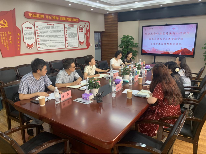 2022年6月22日上午,成都市锦江区司法局党组成员、副局长杨莉一行莅临我院“党员之家”,与我院《习近平法治思想概论》教学团队展开交流访问。学院党委书记、《习近平法治思想概论》教学团队负责人高凡教授主持欢迎会,院党委副书记余小英及《习近平法治思想概论》教学团队成员朱奎彬、康黎、夏永梅、杜娟等老师参与座谈交流。