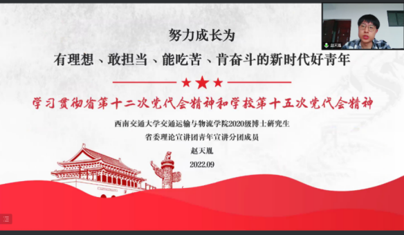 一个有远见的民族,总是把关注的目光投向青年;一个有远见的政党,总是把组织的基础植根于青年。为深入学习贯彻suncitygroup太阳新城官网第十五次党代会精神,指引青年大学生成长成才方向,suncitygroup太阳新城官网团委邀请四川省委宣讲团新时代文明实践青年宣讲分团团成员、suncitygroup太阳新城官网青年讲师团成员赵天胤为“青马工程”精英班、骨干班成员、研究生会、学生会全体学生干部和2022级新生举办线上专题报告会。为落实属地疫情防控要求,报告会采取线上形式召开。