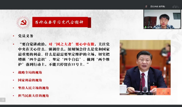 “一个人,一个民族,他所信仰的不应该是束缚自己手脚的桎梏,更不应该是绞杀自己的绳索,而应当是一股风,一股催你挺进、催你跋涉、催你奋斗的风。因此,新时代青年应当坚持习近平新时代中国特色社会主义思想,向党组织积极靠拢。“赵老师对青年与祖国共成长提出期许,鼓励我们在中华民族伟大复兴的征程中作出自己的贡献。接着,赵老师又以一位学长的身份,从日常学习、科研竞赛、学生工作三方面为大家作出指导,他以亲身经历教育我们要做到“四个学会”:学会做事、学会做人、学会相处、学会学习。