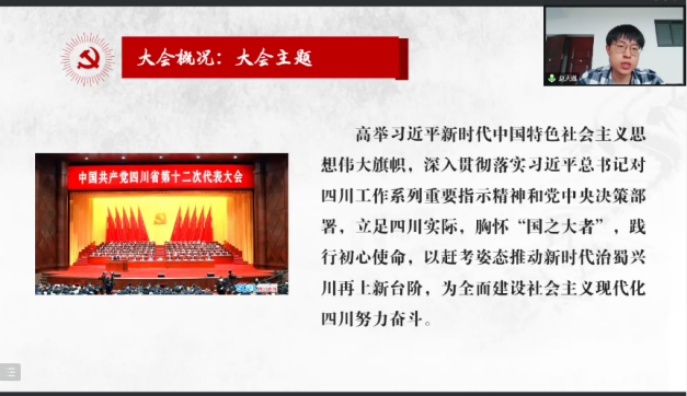 赵老师还传达了四川省第十二次党代会的会议精神。他要求同学们深刻学习和领会四川省第十二次党代会的重大意义,坚持新时代治蜀兴川的根本遵循,领悟过去五年四川省牢记嘱托、砥砺奋进取得的重大成就,把握四川发展的内外形势,明确新时代治蜀兴川的战略牵引和未来五年经济社会发展的重点任务,牢记纵深推进全面从严治党的明确要求,为全面建设社会主义现代化四川努力奋斗!