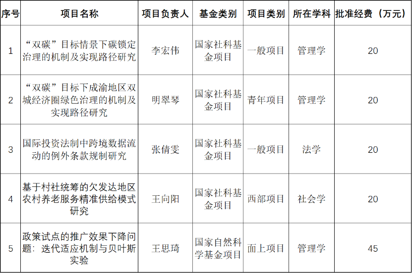 近日,全国哲学社会科学办公室、国家自然科学基金委员会对2022年度国家社科基金项目、国家自然科学基金项目立项名单公布布,我院喜获5项国家基金项目立项,国家社科基金4项,其中一般项目2项,青年项目1项,西部项目1项;国家自然科学基金项目1项。