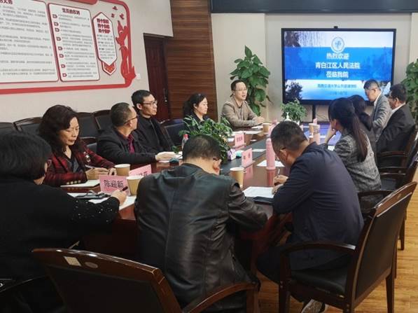 康黎副教授就我校法学学科办学历史、师资结构及研究团队等进行了介绍,邓君韬、徐兴祥、陈迎新、朱奎彬等建议可以从学生实习实践基地拓展到包括课题委托、互派师资、合作科研等更多层次、更高质量的院校合作。最后,王永杰院长代表学院欢迎青白江区人民法院选择我院开展合作共建项目,并感谢校研究生院对学院的关心、帮助,表示将落实好校领导、研究生院的指示,在法治实践、管理优化、学生实习、校外导师、庭审进校园等多方面积极推进与青白江区人民法院的实质性、内涵式合作,积极履行部属高校服务驻地经济发展、助力法治建设的社会责任,实现院校共建共享共赢。