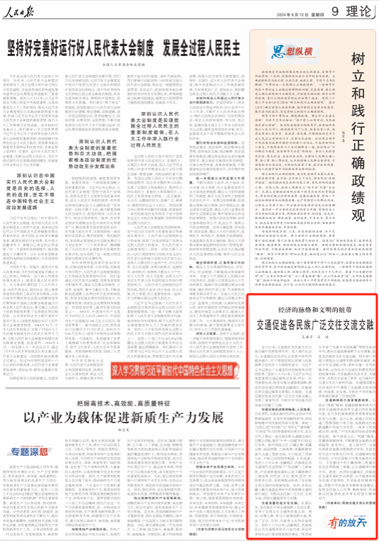 近日,《人民日报》理论版刊发了我院教师王浩宇、王斌署名文章《交通促进各民族广泛交往交流交融》。“人民网”“求是网”“光明网”“中国网”等多家权威媒体先后进行转载。
