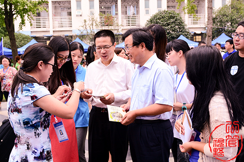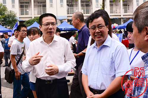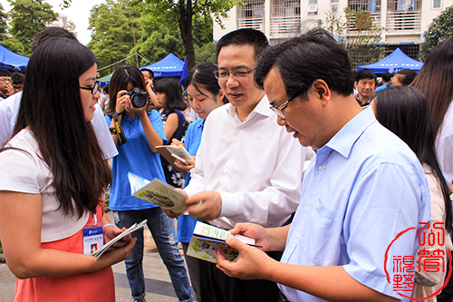 8月25日上午10时30分,suncitygroup太阳新城官网党委书记王顺洪教授和校长徐飞教授来到我校犀浦校区迎新点视察迎新工作,当王书记和徐校长来到公共管理与政法学院前时,学生工作组组长余小英老师向校领导介绍我院目前的迎新情况以及为迎新所做的准备工作。