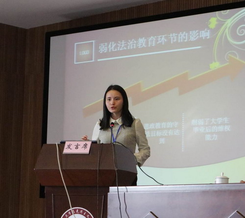 我院2014级法学硕士研究生罗娟向论坛提交《全面依法治国背景下大学生思政教育中法治意识教育强化路径研究》一文,在依法治国的大背景下,通过思政教育中法治教育不足的表象深层次地挖掘了导致这一现象出现的原因,并进行相应的对策分析。经过专家的提议,罗娟同学在论坛上做10分钟的主题发言。