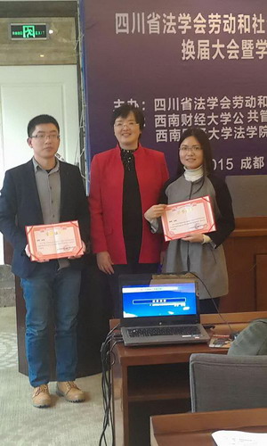 “主题发言”共分为两场,主要议题有“互联网+、新业态与劳动法律关系”和“人口生育新政策、社会保障与医疗改革”。我院毕业的法学硕士、实习律师王娜与在读的法学硕士伏浩合作完成了《“互联网+”交通新业态下网络约车行业劳动关系分析》并应邀做主题发言,我院杨珊副教授应邀作为点评嘉宾对王娜等三篇论文进行了精彩点评。闭幕式上,四川省法学会劳动和社会保障法学研究会会长章群教授对评选出的优秀论文作者进行颁奖,并特别表扬了我院师生团队的学术成果,并预祝交大120周年校庆顺利。