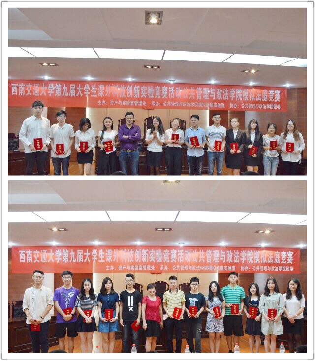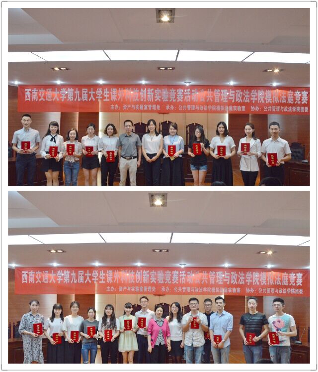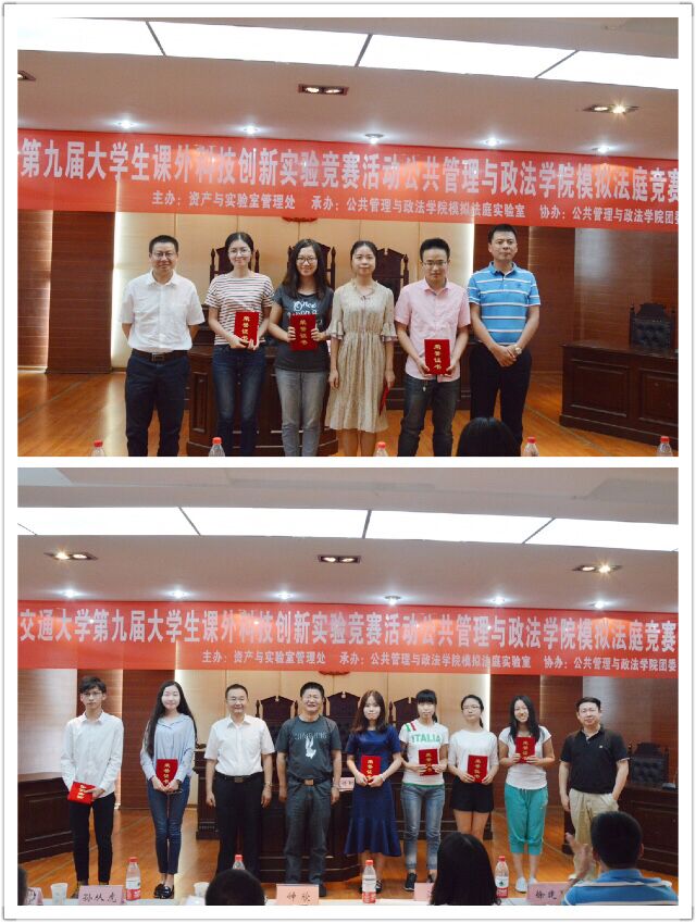 赛程的最后一项是颁奖典礼,由各位专家评委为获奖团队颁奖,并合影留念。至此,模拟法庭竞赛活动圆满结束。模拟法竞赛为同学们提供了一个展示自我、锻炼自我、提升自我的舞台,更为同学们打造了一个交流思想、明辨是非、学以致用的广阔平台。公共管理与政法学院法学系、模拟法庭实验室也必将贯彻执行suncitygroup太阳新城官网大学生课外创新实验竞赛活动的宗旨,不断积累和总结模拟法庭活动的成功经验,将模拟法庭竞赛这一品牌赛事办的更好。