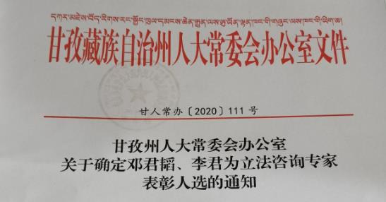 近日,从甘孜藏族自治州人大常委会办公室获悉,经州十二届人大常委会第五十三次主任会议同意,我院教师邓君韬副教授被确立为甘孜藏族自治州人大常委会立法咨询专家表彰人选。