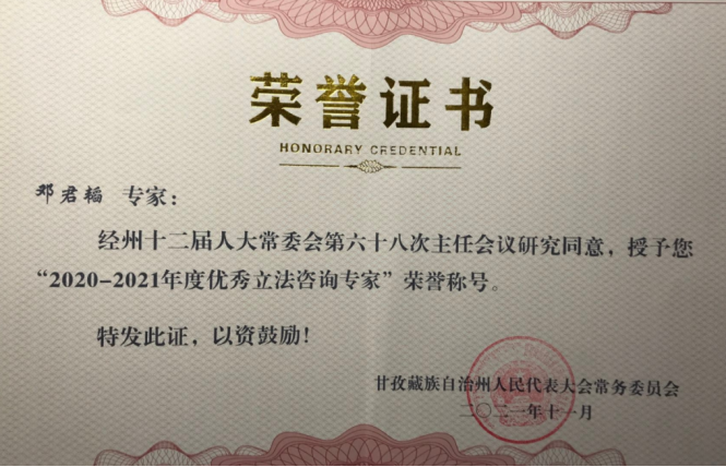邓君韬副教授获聘州人大常委会立法咨询专家以来,履职尽责,2020年底,完成《关于<甘孜藏族自治州森林草原防灭火条例(草案)>的意见建议》,提出“森林草原防灭火联防联灭机制”、行政代履行应明确适用前提等完善建议;2021年3月,认真比对《甘孜藏族自治州自治条例》《甘孜藏族自治州实施<四川省河道采砂管理条例>的补充规定》与新出台的上位法《长江保护法》相互关系,协助州人大相关专委会做好法规清理工作;2021年6月,参加州人大组织的《甘孜藏族自治州藏传佛教事务条例(修订草案)》立法论证会,提出以自养为目的的经营活动管理规范等十余项完善建议,供地方立法决策参考;2021年9月,从“以人民为中心”“生命至上、安全第一”理念出发,就《甘孜州森林草原防灭火标本兼治总体方案》提出四项专家咨询意见,协助做好备案审查相关工作。