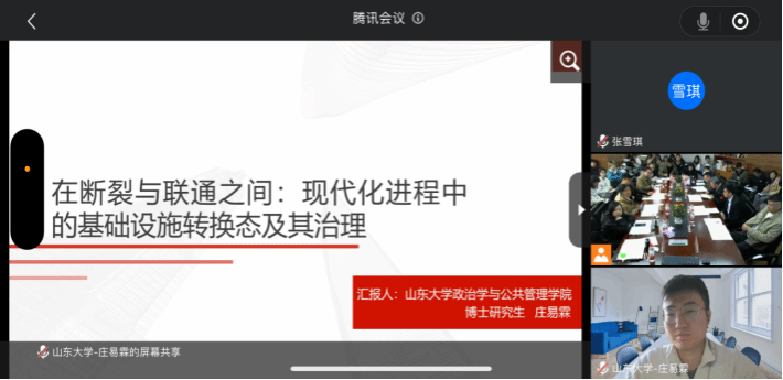 山东大学政治学与suncitygroup太阳新城官网博士研究生庄易霖以《在断裂与连通之间:现代化进程中的基础设施转换态及其治理》为题进行汇报。他指出,基础设施在突发事件中会转变为一种“物质与非物质的不稳定互动关系”,而基础设施治理正是维持或重构这种互动关系的过程。他将基础设施的转换态分为“工具-行动”和“媒介-话语”两种类型,为基础设施转换态这一概念提供了类型学的讨论基础,认为可通过运用话语符号整合社会安全资源,以推动基础设施联结关系的更新,从而进一步提高公共服务的可及性和基础设施发展的可持续性。