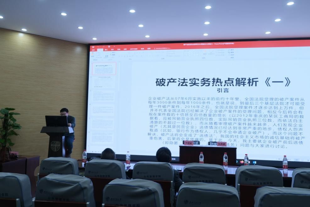 讲座开始后,郭老师首先在分析破产逃债行为所涉案件统计数量的基础上,重点探讨了破产逃债的破产法、刑法成因等热点问题。而后,郭老师还具体讲解了担保财产处置问题与未支付的执行款是否属于破产财产等问题。郭老师提到,破产法学的内容横跨实体法与程序法,涉及民商法、经济法、刑法等多个实体部门法,其调整对象、立法目的的多元化的特殊性决定了公权力在破产法中不同于其他民商事法律的地位。