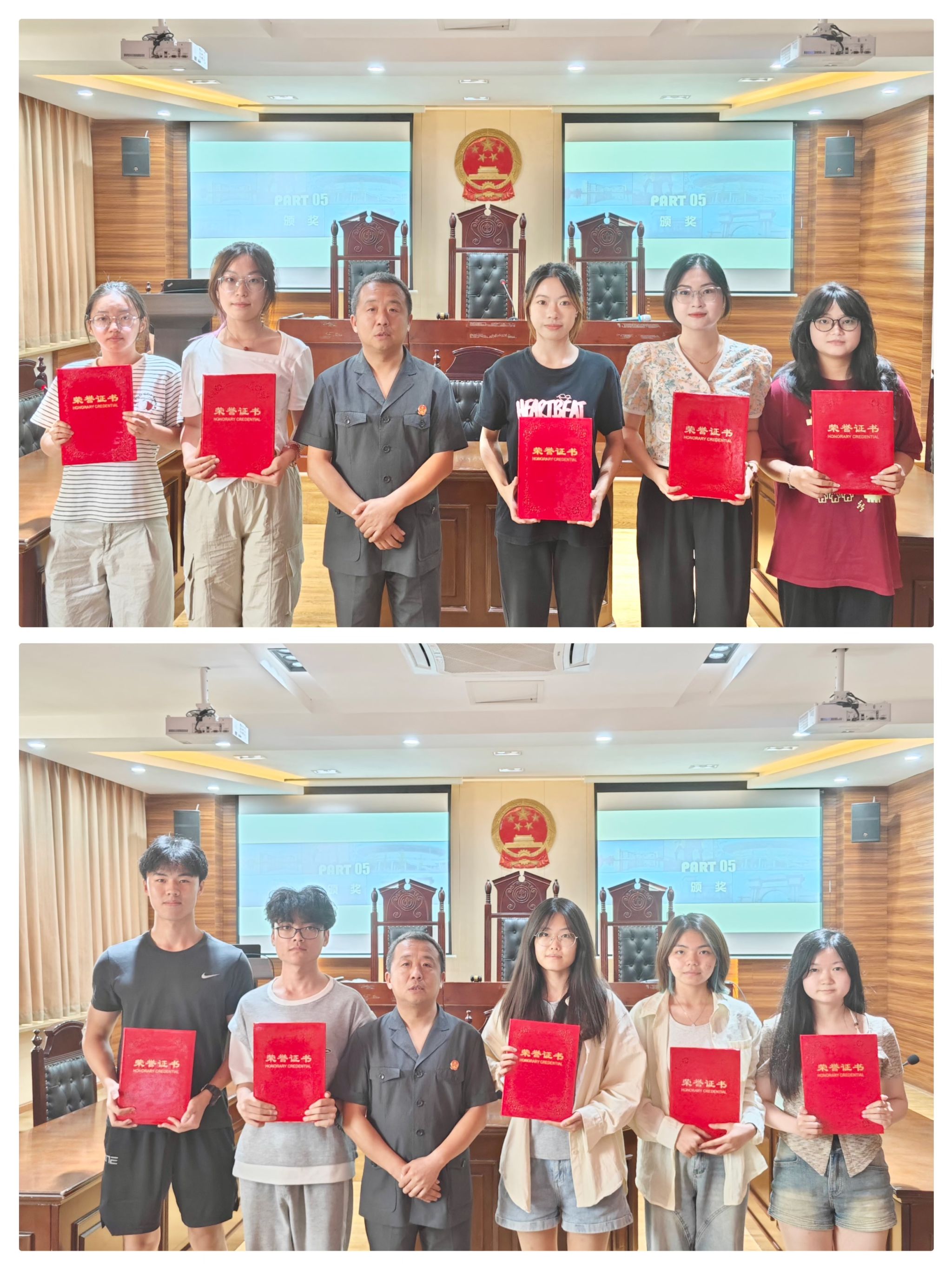 赛事已经接近尾声,王庭长宣布了决赛两支参赛团队的最终成绩和本次模拟法庭竞赛的获奖情况:杜星瑶团队荣获本次模拟法庭竞赛的冠军,高博团队获得亚军,两支参赛团队双双荣获一等奖;刘雨晨、康雪雪两支参赛团队荣获二等奖;张瑞轩、刘瑾仪、曾梓涵、王涵玉四支参赛团队荣获三等奖,陈佳佳、叶思宁两支参赛团队荣获优胜奖。最后,祝院长、王庭长、刘庭长和张法官分别为获奖队伍颁奖并与参赛团队合影留念。