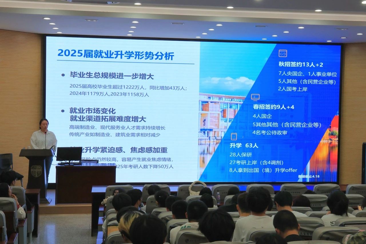 石老师首先从学院2025届学生的就业升学总体形势引入,分析当前及未来就业形势。结合2024届、2025届考研及就业详细数据,提出综合考量专业与就业匹配关系、提早做职业规划、拓展就业渠道等针对性建议;结合学校智慧就业网相关信息展示求职就业时间安排,鼓励2026届学生坚定方向、锚定目标,选择适合自己的发展道路。