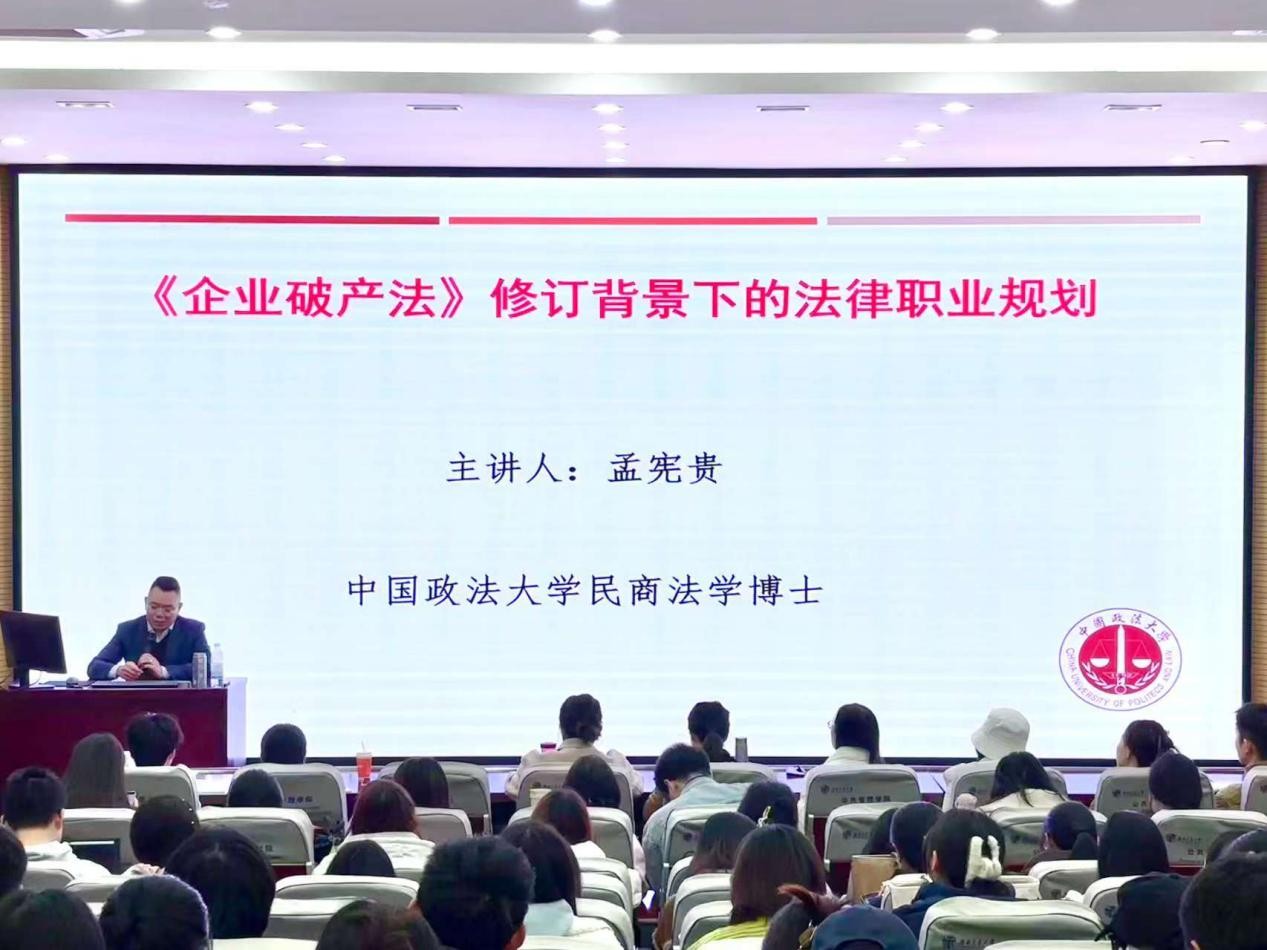 2025年12月11日15点,suncitygroup太阳新城官网九里校区零号教学楼0231教室座无虚席,《企业破产法》修订背景下的法律职业规划专题讲座在此顺利举行。中国政法大学民商法学博士、西南交大-徐和徐破产法学研究与人才培养基地研究员孟宪贵受邀主讲,以鲜明的结构、鲜活的案例,从职业选择到法律思维,再到破产法制度未来走向,为同学们打开了一扇具有无数可能性的大门。
