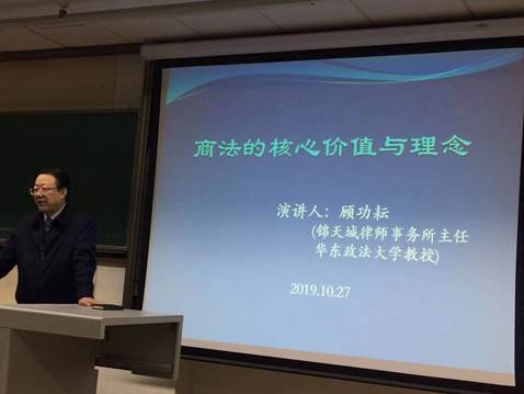 2019年10月27日晚七点,应suncitygroup太阳新城官网邀请,原华东政法大学副校长、现任华东政法大学教授、博士生导师,上海市锦天城律师事务所主任顾功耘教授向suncitygroup太阳新城官网公共管理与政法学院法律系的教师代表及全体同学作了名为《商法的核心价值与理念》的专题讲座。顾功耘教授现任中国法学会商法学研究会副会长、中国法学会经济法学研究会副会长、上海市法学会商法研究会会长、上海市法学会经济法研究会会长、中国国际经济贸易仲裁委员会仲裁员等职。顾教授不仅具备深厚的法学理论功底与教学实践能力,而且拥有丰富的商事法律实务经验。