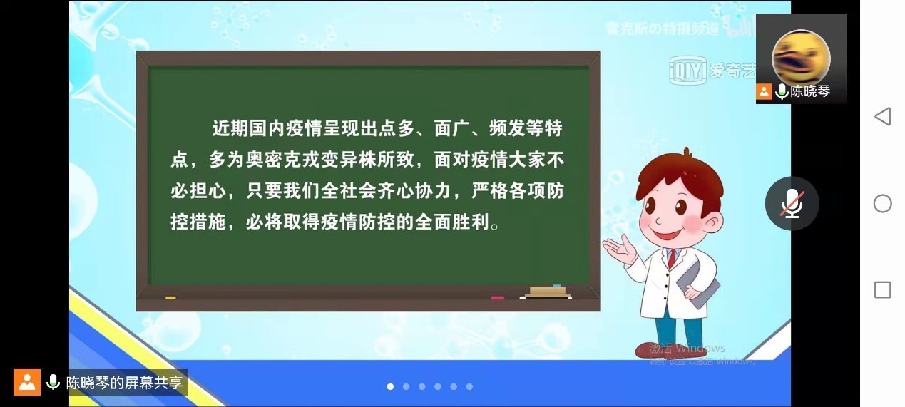 其次是“奥密克戎变异毒株的科普介绍”视频短片。短片中将两年来所出现的病毒名称和病毒变异进行了简易、深刻的阐释。日前“奥密克戎变异毒株”已经造成大量感染者,并且隐匿性更强,传播速度更快。并且隐匿性强更容易让感染者误以为是普通感冒或者是季节性流感,这也给预防和控制工作带来了不小挑战。最后给予“佩戴口罩、勤洗手、常通风、不聚集、不离汉、保持社交距离”六大方面注意事项助力疫情防控。