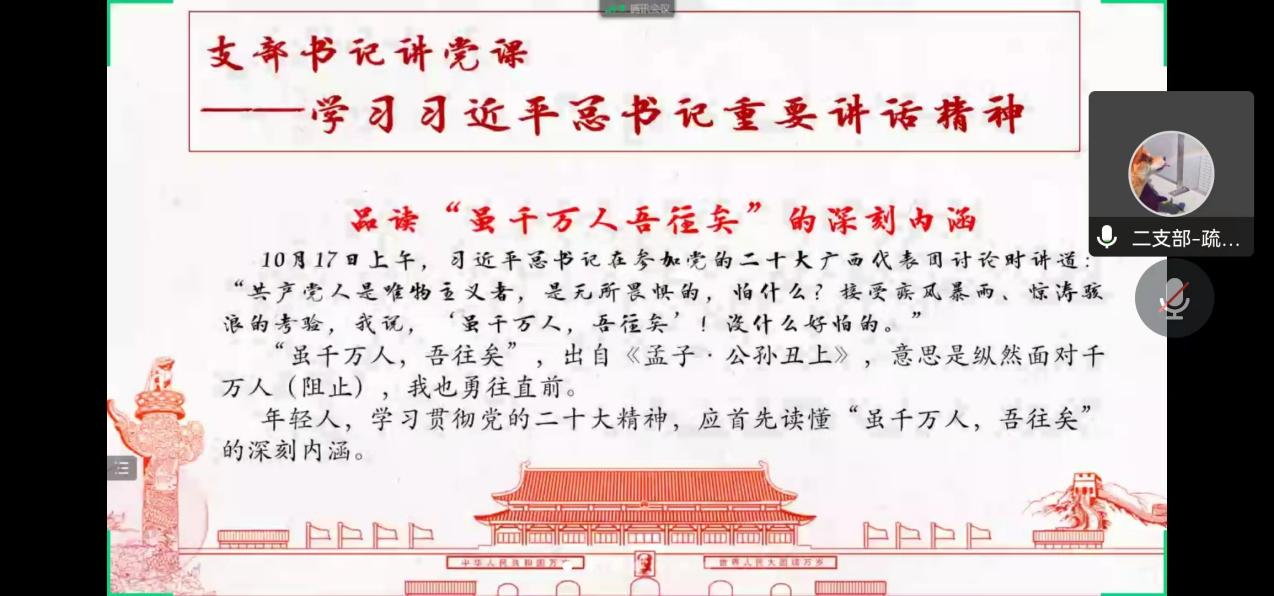 然后,疏金金同志结合“虽千万人吾往矣”文章,带领参会党员学习了习近平总书记重要讲话精神。疏金金同志提出,年轻人,学习宣传贯彻党的二十大精神,应首先读懂“虽千万人,吾往矣”的深刻内涵。他从以下三个方面讲解:从“得罪千百人、不负十四亿”中读懂反腐败“虽千万人,吾往矣”的鲜明态度;从“披荆斩棘、栉风沐雨”中读懂脱贫攻坚“虽千万人,吾往矣”的历史担当;从“人民至上、生命至上”中读懂疫情防控“虽千万人,吾往矣”的为民情怀。