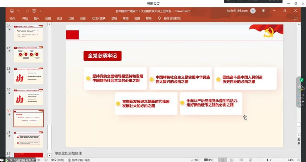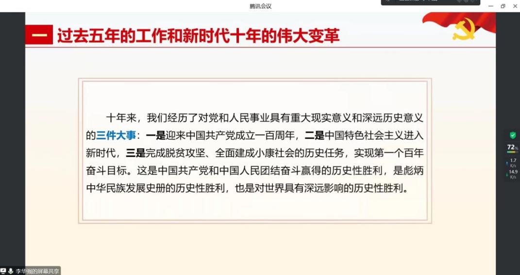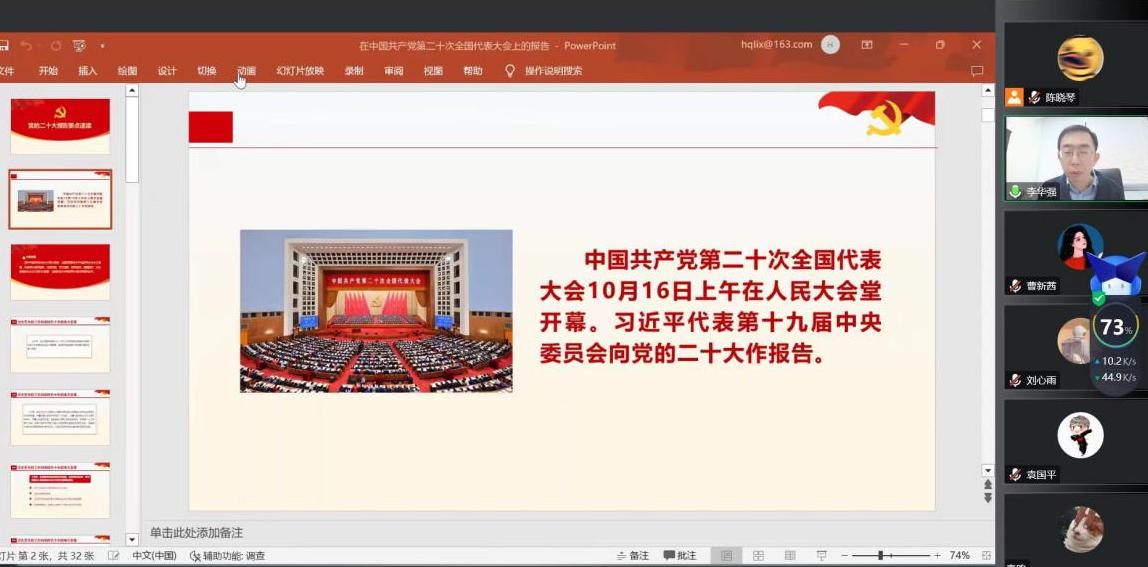 为深入学习贯彻党的二十大精神,根据学校《关于做好党的二十大精神学习培训的工作提示要求》,12月15日15:00,我院党委委员、副院长李华强在腾讯会议开展了党的二十大精神专题宣讲活动,教工机关党支部、硕士2020级公管第一党支部、硕士2022级公管资环第二党支部的全体党员参加。