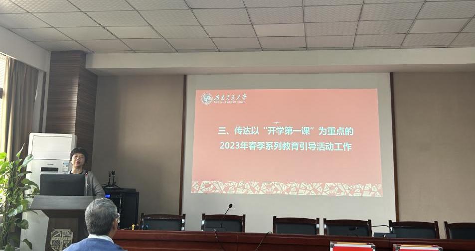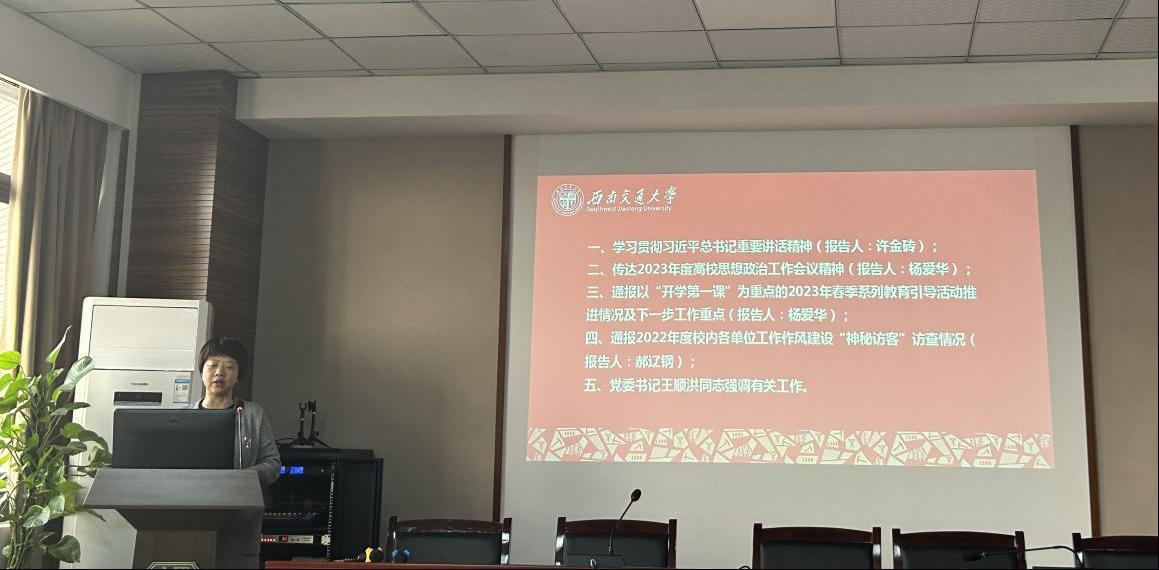 首先,学院党委书记高凡传达了习近平总书记在中共中央政治局常务委员会会议上的重要讲话精神、2023年教育系统全面从严治党工作视频会议精神、2023年度高校思想政治工作会议精神及学校2023年春季学期党委书记工作会议内容。