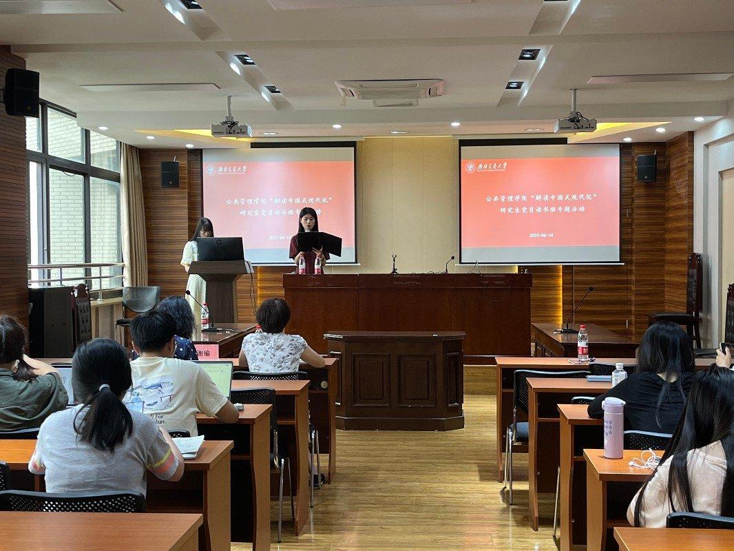 为深入学习宣传贯彻习近平新时代中国特色社会主义思想,高质量完成主题教育各项工作,引导广大学生党员学习中国式现代化的主要内容、本质要求和重大原则,深刻理解“两个确立”的决定性意义,增强“四个意识”、坚定“四个自信”、做到“两个维护”。2023年6月14日下午15:00,suncitygroup太阳新城官网硕士2022级法学第一党支部在九里校区零号教学楼01417开展“解读中国式现代化”研究生党员读书班专题活动。本次研究生党员读书班邀请马克思主义学院副院长谢瑜教授作为嘉宾进行理论讲授,出席本次活动的领导有suncitygroup太阳新城官网党委书记高凡教授,学院硕士2022级全体研究生党员参加了此次活动。