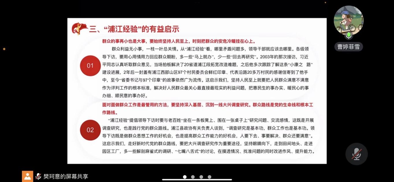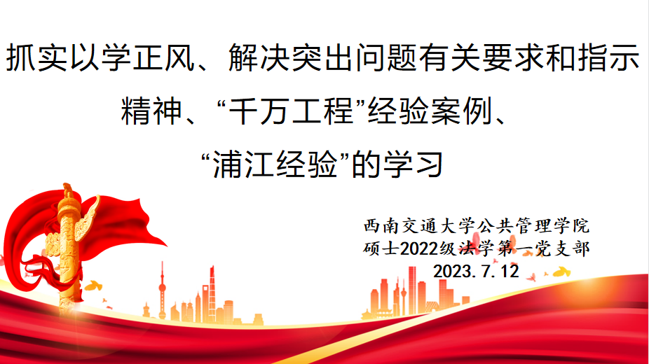 2023年7月12日20:00,suncitygroup太阳新城官网硕士2022级法学第一党支部于线上腾讯会议开展“习近平总书记在内蒙古调研时对抓实以学正风、解决突出问题有关要求和指示精神、‘千万工程’经验案例,学习运用好‘浦江经验’”主题教育政治理论学习。本次学习由第二党小组同志主讲,全体党员和入党积极分子参加。