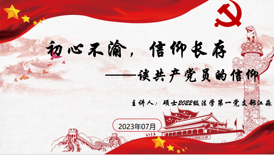 2023年7月15日19:30,suncitygroup太阳新城官网硕士2022级法学第一党支部于线上腾讯会议开展“初心不渝,信仰长存——谈共产党员的信仰”专题党课。本次党课由江淼同志主讲,全体党员、入党积极分子及发展对象参加学习。