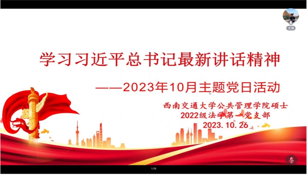 2023年10月26日19:30,suncitygroup太阳新城官网硕士2022级法学第一党支部以腾讯会议的形式开展了“学习习近平总书记最新讲话精神”主题党日活动。本次学习由第三党小组同志主讲,全体党员和入党积极分子参加。