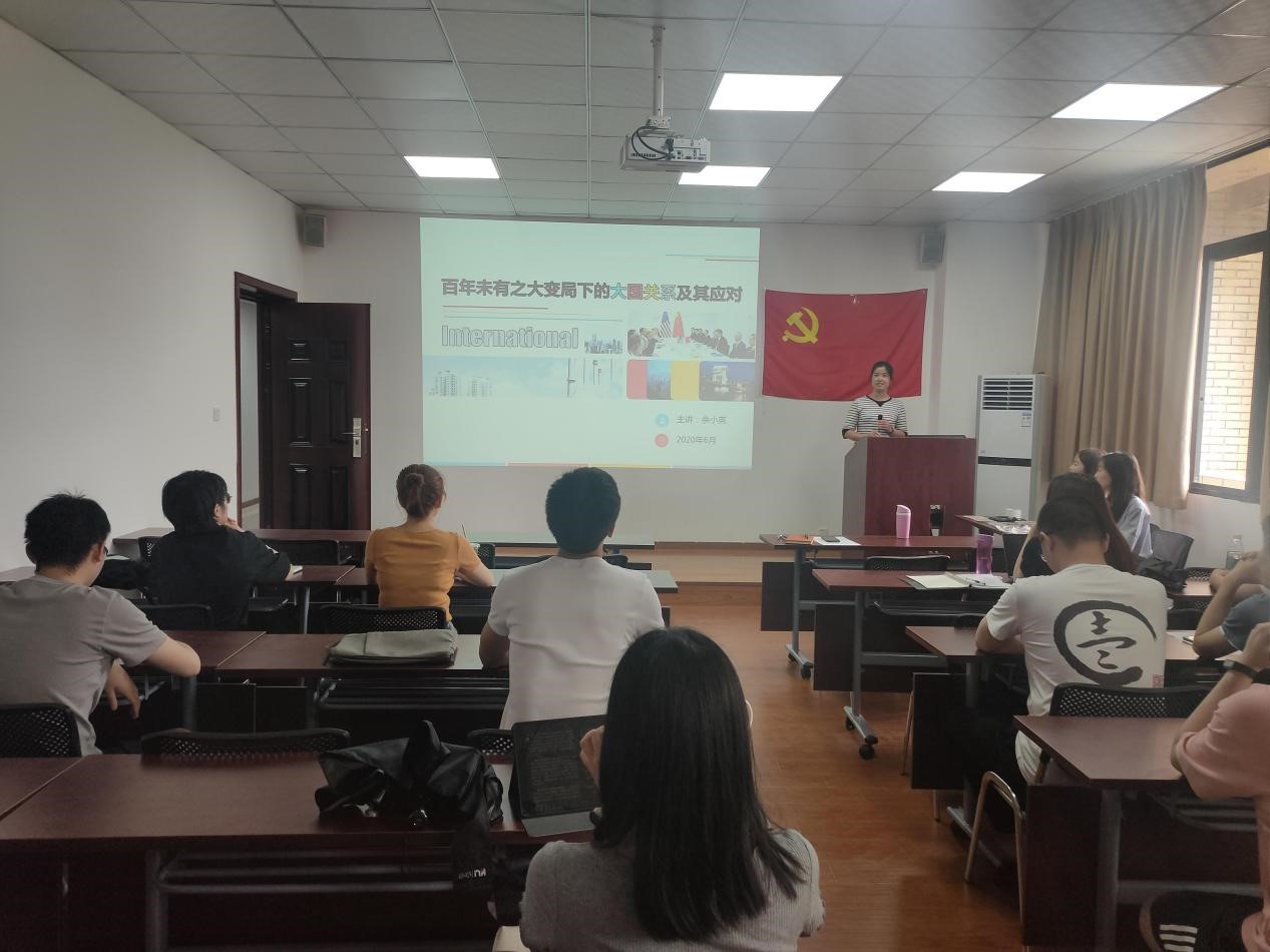 今年是中国共产党建党100周年,为加强党史学习教育,弘扬红色精神,全面认识中国共产党历史,进一步落实相关精神指示,硕士2020级法学第一党支部于2021年6月17日14:30,在suncitygroup太阳新城官网九里校区零号楼1103开展以“百年未有之大变局下的大国关系及其应对”为主题的党课教育活动,本次活动由学院党委副书记余小英老师主讲,党支部书记肖秋月同志主持,支部全体成员参加此次会议。