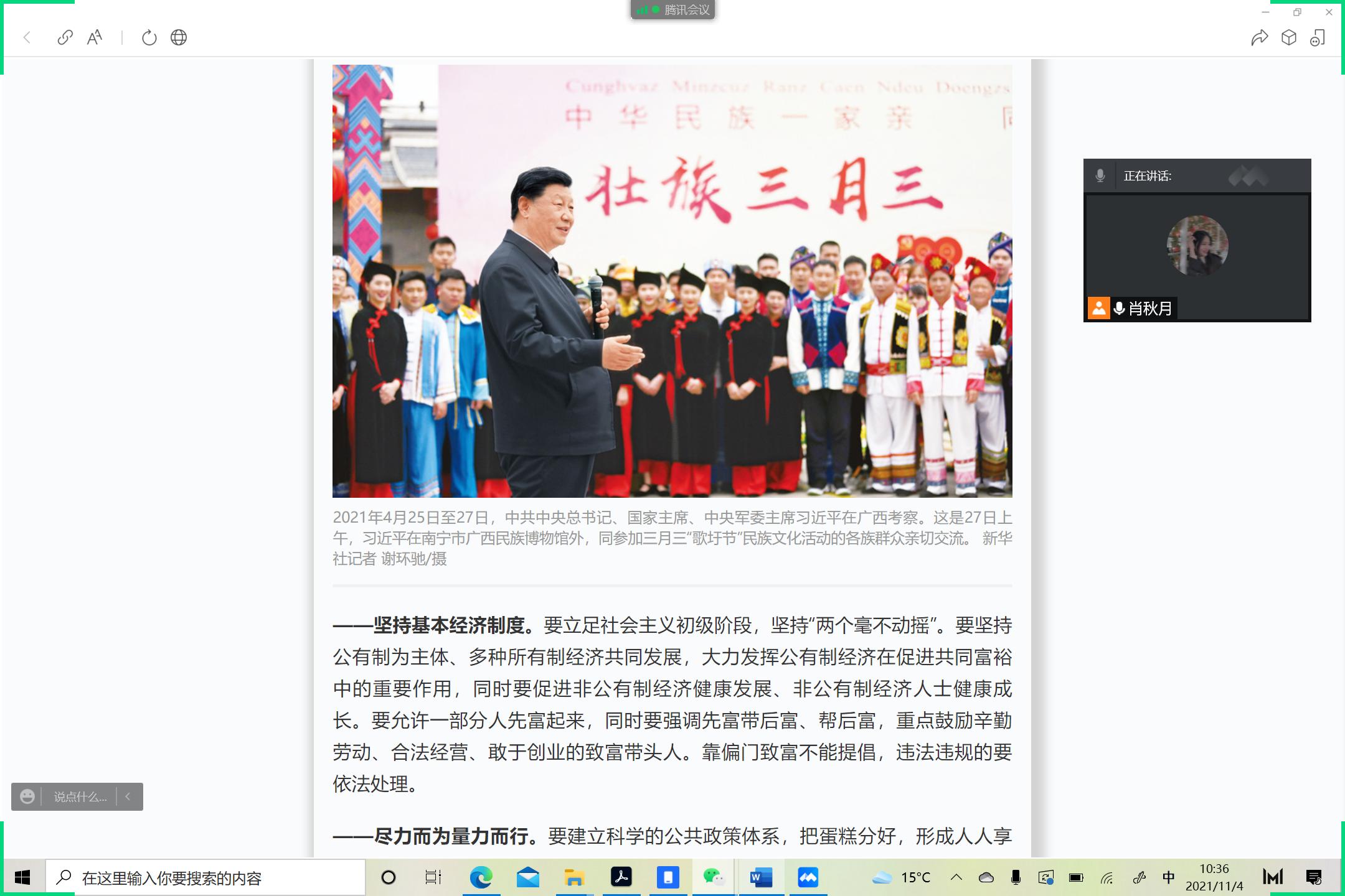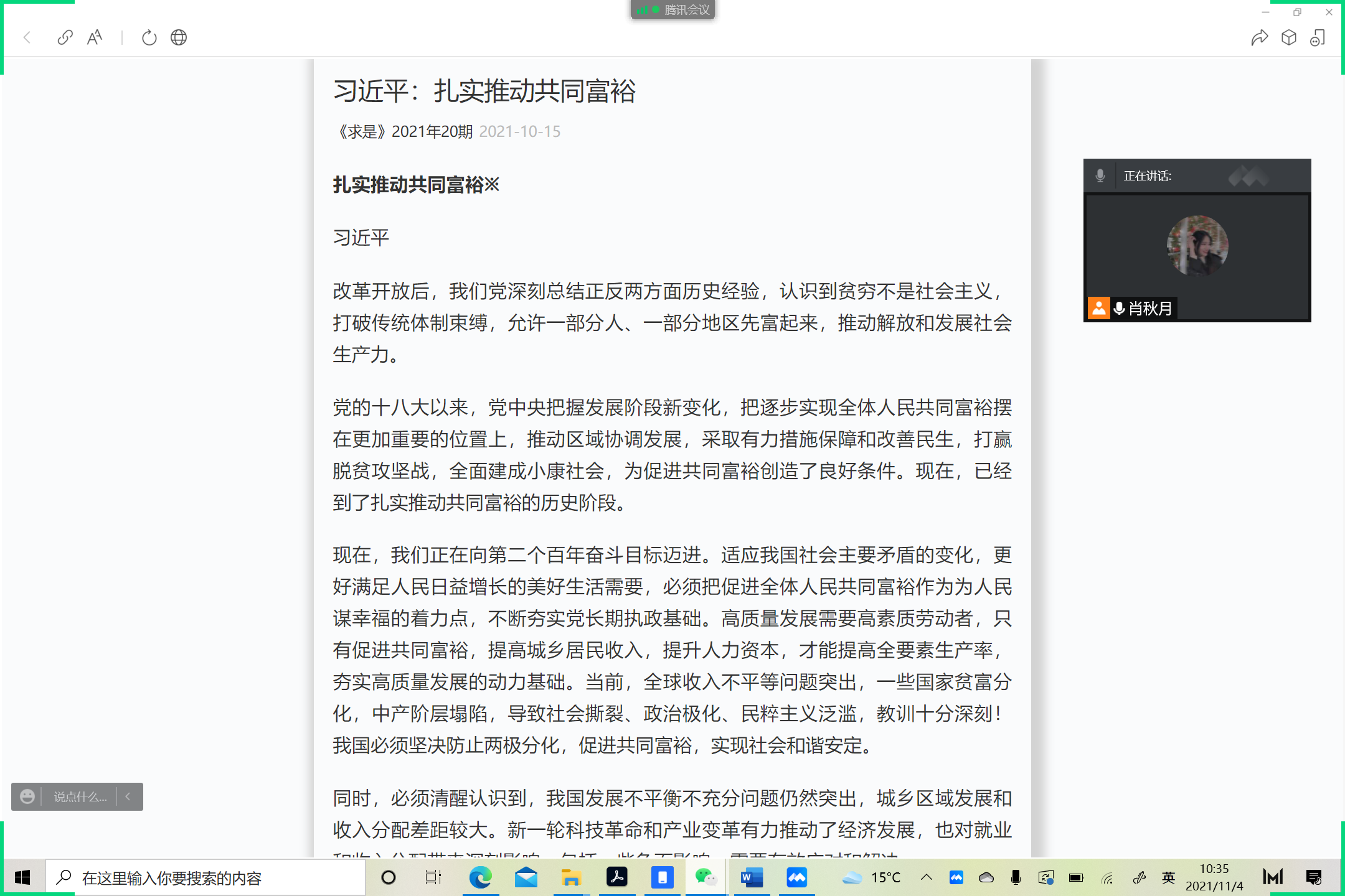 习近平总书记在刚刚出版的第20期《求是》杂志上发表重要文章《扎实推动共同富裕》,对共同富裕作出新的阐释:“我们说的共同富裕是全体人民共同富裕,是人民群众物质生活和精神生活都富裕,不是少数人的富裕,也不是整齐划一的平均主义。”为深入学习领会习近平总书记关于“共同富裕”的重要讲话精神,硕士2020级法学第一党支部于2021年11月4日21:00进行了集中学习,支部全体成员参会。