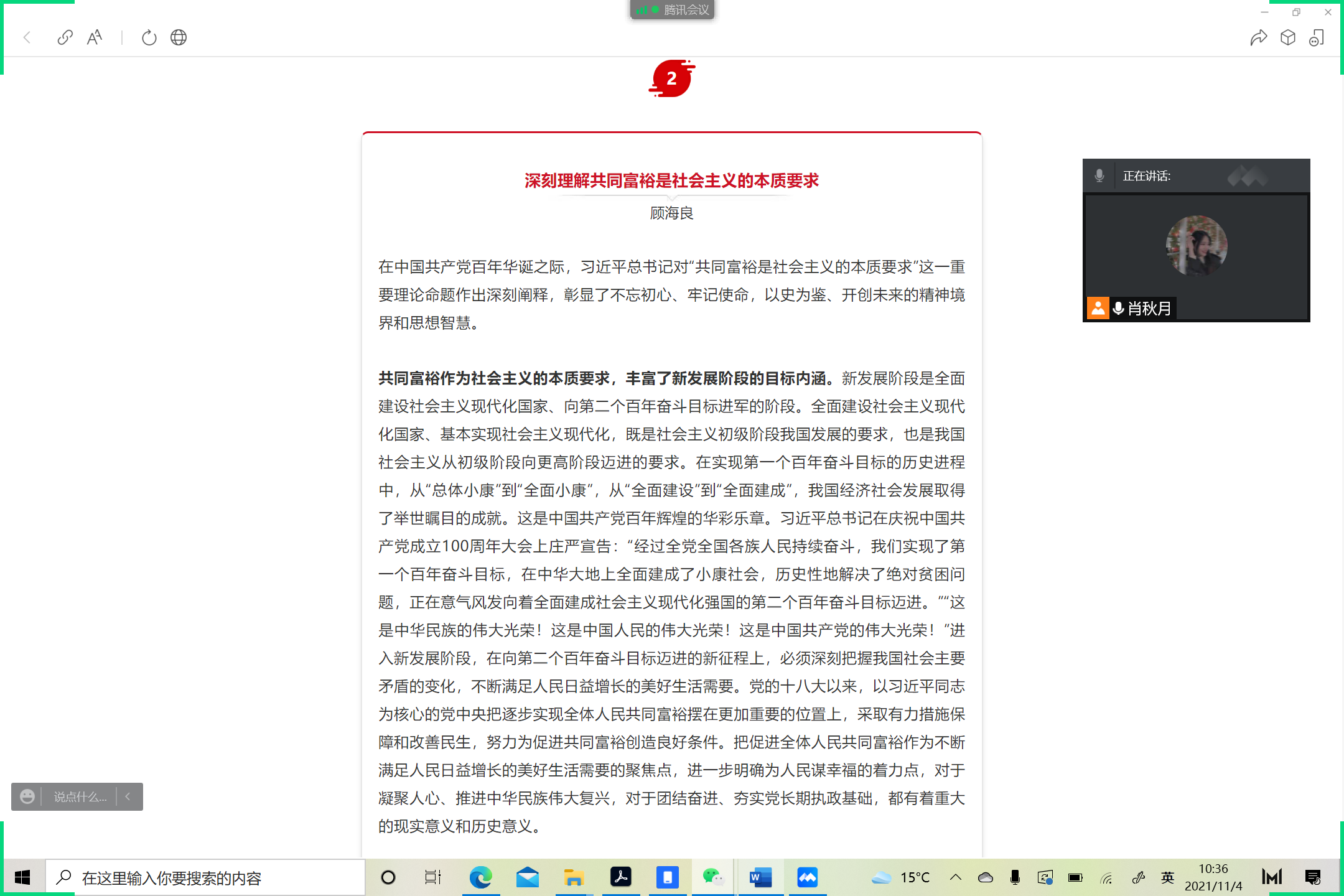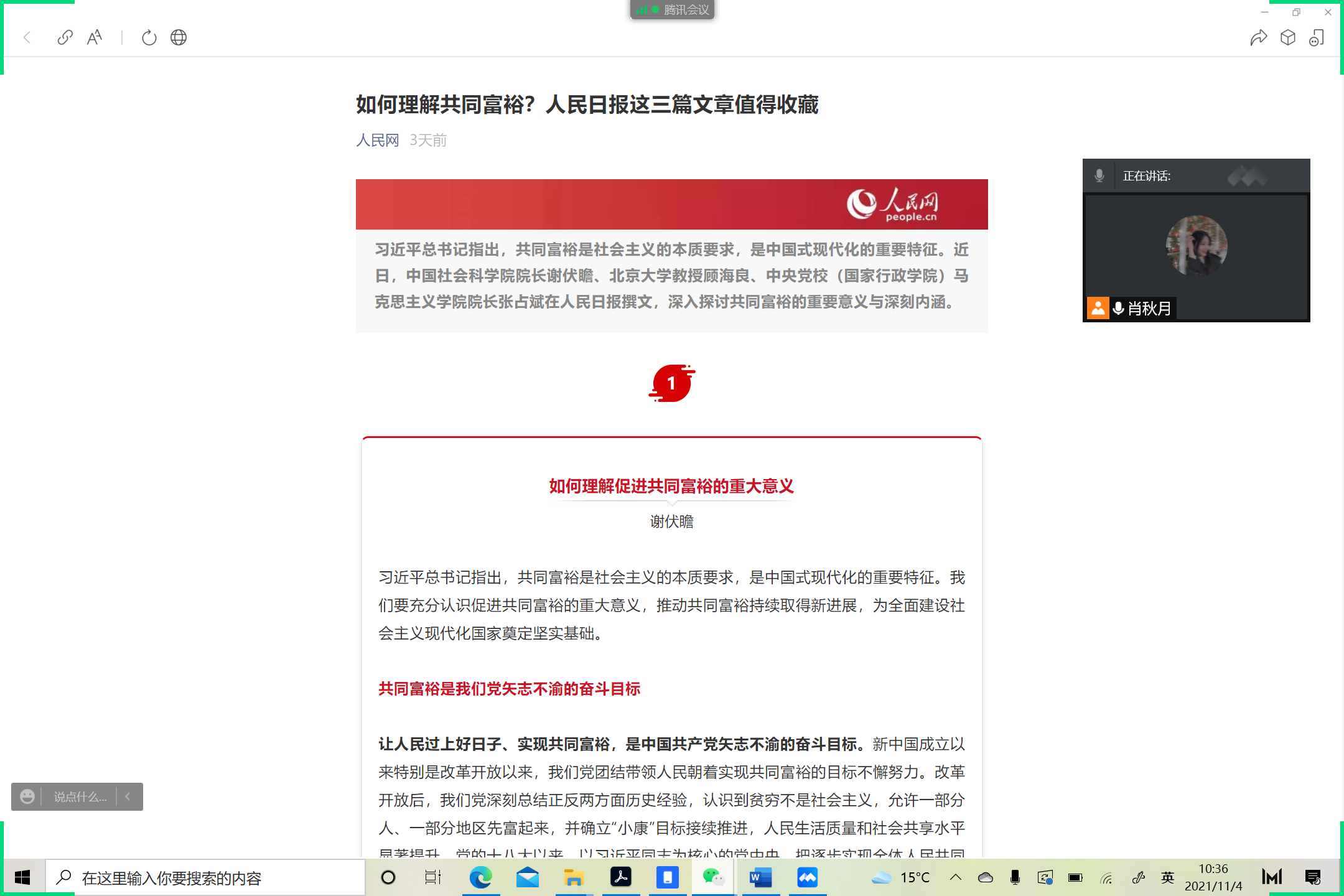 其次,肖秋月同志又与支部同志一起学习人民日报上解读共同富裕的三篇文章。第一篇是谢伏瞻的《如何理解促进共同富裕的重大意义》,文章从共同富裕是我们党矢志不渝的奋斗目标、促进共同富裕丰富了人类现代化的内涵、准确把握促进共同富裕具有特殊重要意义三方面出发,层层递进,准确解读促进共同福语的重大意义。