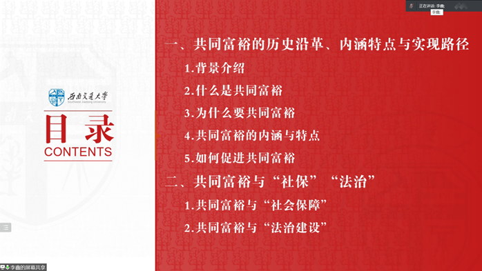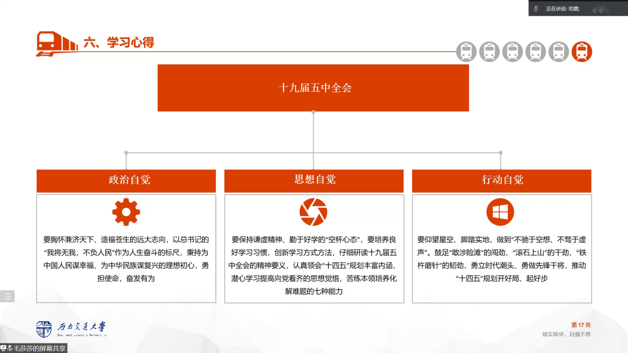 会议从四个主题进行小组汇报,分别是《人类命运共同体》、《成渝双城经济区》和《理解共同富裕》。汇报从宏观到微观,涉及了从思想到具体举措的方方面面。通过此次汇报实践活动,学院2021-04期发展对象们一起学习了党在新的历史阶段的重要思想,切身感受了新时代中国共产党的生机活力,同时也领悟到作为新时代一员自己肩负的责任。
