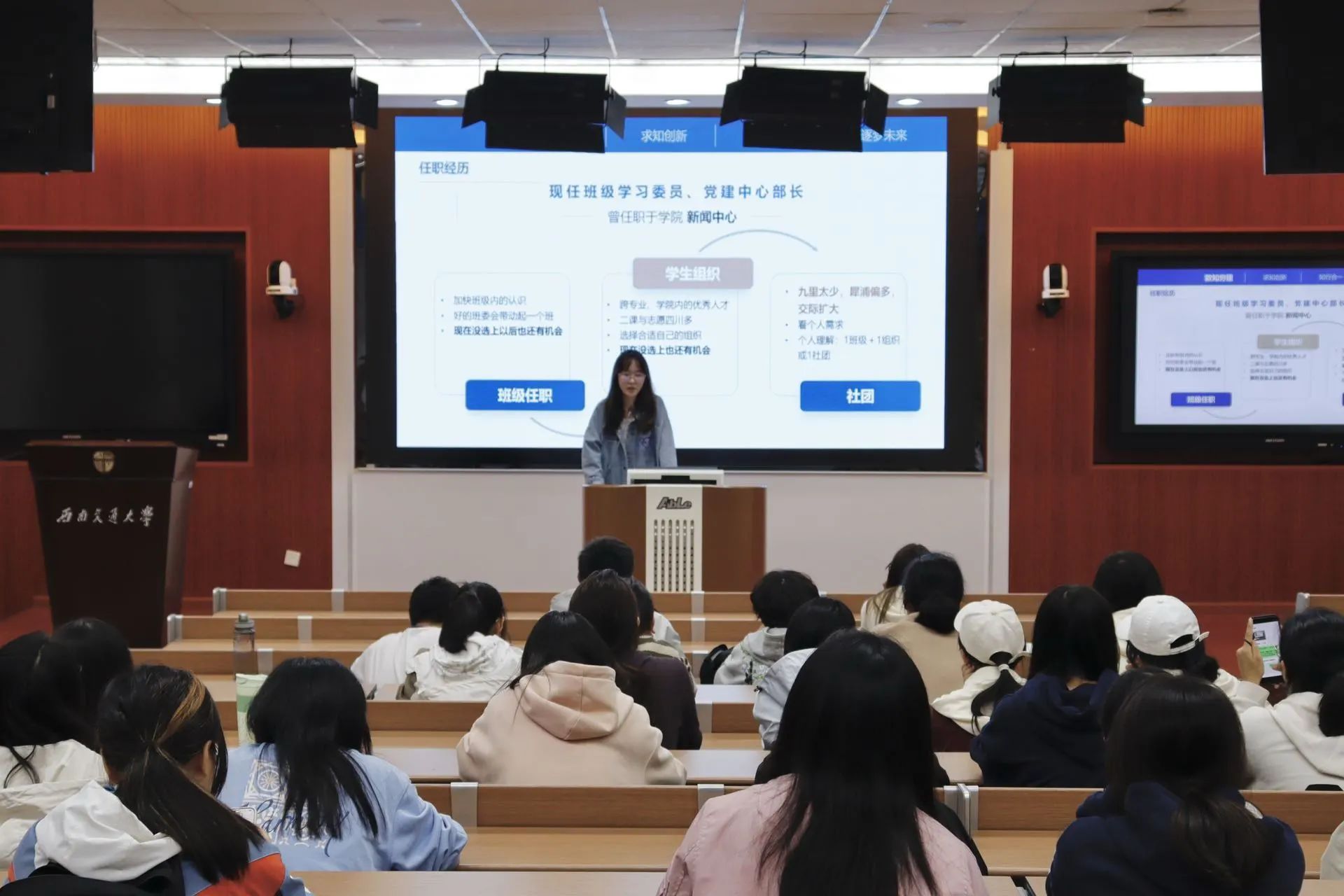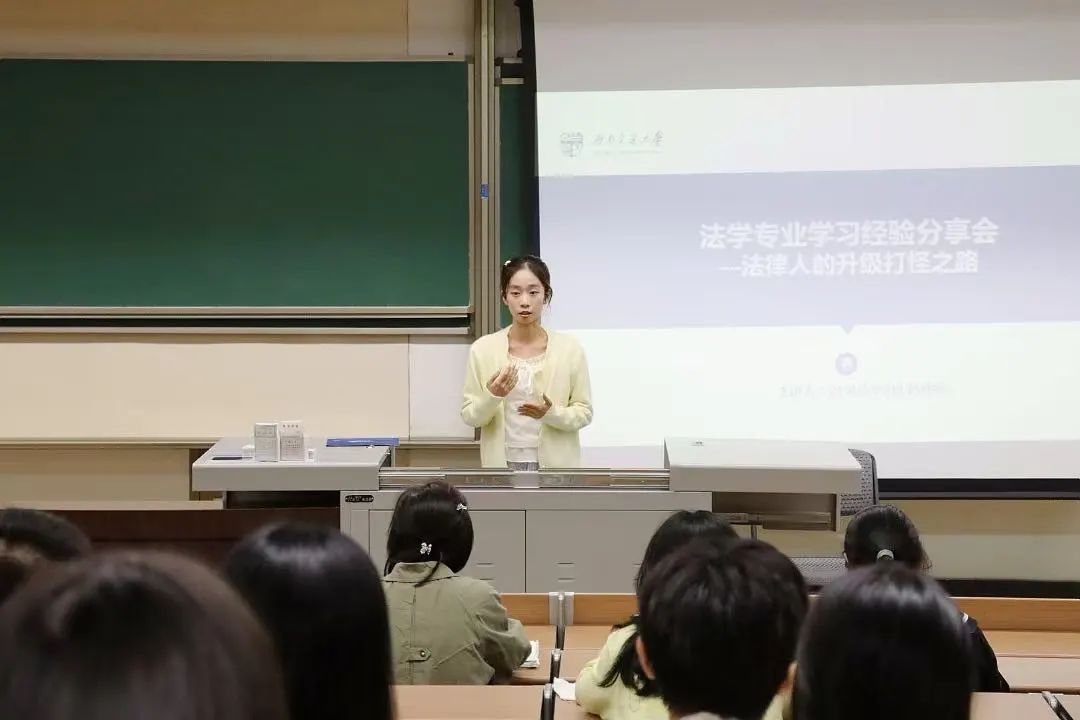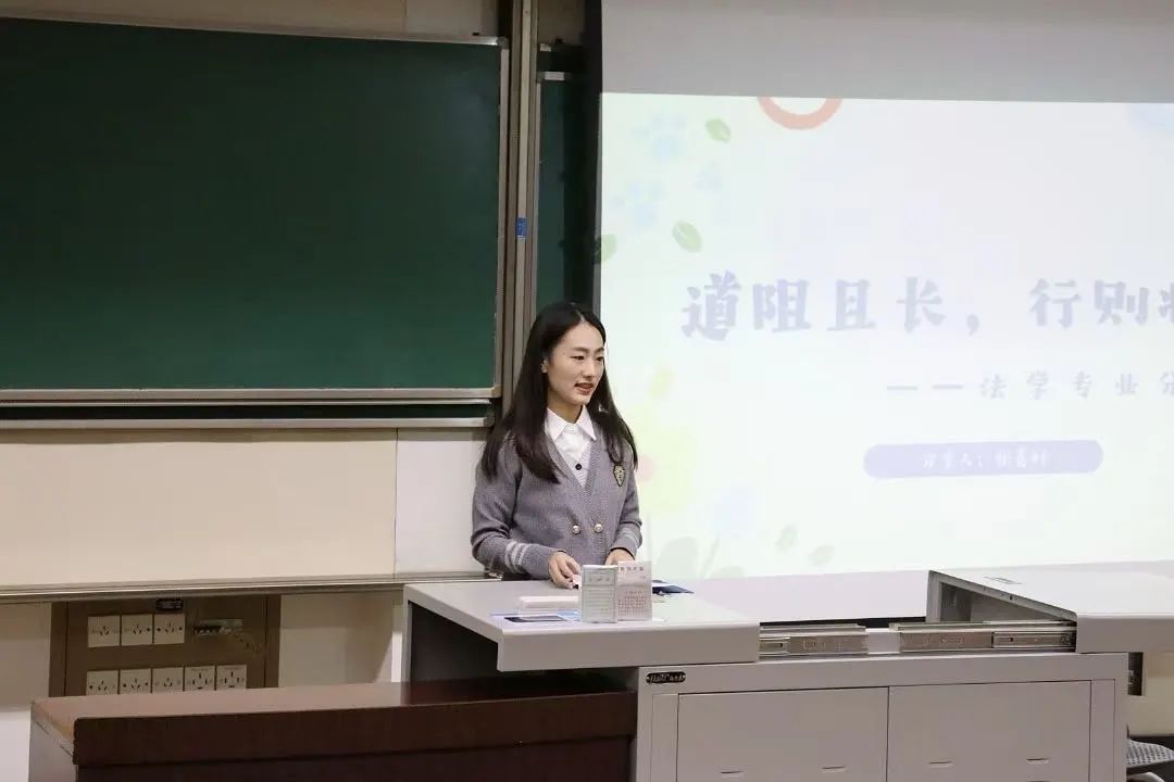 法学专业的陈炜婷与张菁妤两位同学也为本科2024级法学专业的新生们带来了一场干货满满的经验分享会。张菁妤同学在分享会上以专业课程学习为切入点,结合科研竞赛与实习实践,介绍了保研的有效策略。此外,张菁妤指出,实习实践是个人成长的重要环节。她建议同学们在规划实习时,优先选择与职业目标契合的机会,以便于未来职业发展并有效实现理论与实践的结合。陈炜婷同学分享了她的经验,强调系统学习和全面发展的重要性。她指出,大学生应摒弃高中教育模式,应当建立系统性的学习方法。陈炜婷同学还强调英语能力的提升,指出英语是学习法学文献和参与国际交流的关键,建议同学们持续提升英语水平。