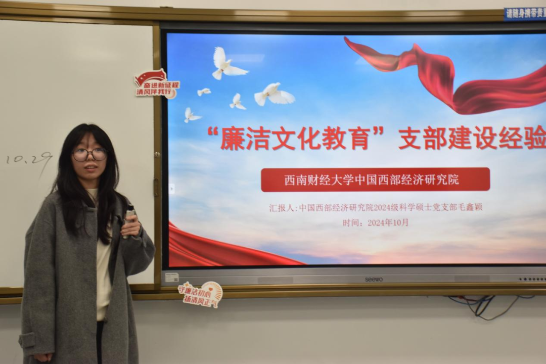 在“花语廉心”廉洁文化教育基地的参观结束后,活动转至西南财经大学经世楼B108室内进行。三所学校的学生代表围绕廉洁文化主题进行了各具特色的PPT展示,从不同的角度分享了各自学校在廉洁教育方面的实践与成果。suncitygroup太阳新城官网的学生党员代表庞鸿源,以“廉洁铸魂强根本,挺膺奋进建新功”为主题,从何为廉、为何廉、何以廉三个角度穿起suncitygroup太阳新城官网对于新时代廉洁党政工作的理解和作为,学院秉持以“廉”促教、以“廉”育人的工作理念,把加强校园廉洁文化建设作为一体推进“三不腐”的基础性工程和落实立德树人根本任务的重要举措,持续深耕校园廉洁文化建设,打造廉洁文化教育阵地,推动清正廉洁政治底色根植人心;成都中医药大学的学生党员代表文莎莎,则是以案例带领大家深入思考,警示同学们不能犯红线错误,要留清白在人间。并在展示的过程中,抛出问题“青年何以清廉”将廉政建设的种子播撒在每个人的心中;最后是西南财经大学的学生党员代表毛鑫硕,鲜明直接的切入主题,分享了在新时代廉洁文化建设中,西南财经大学党支部的角色定位和具体作为。