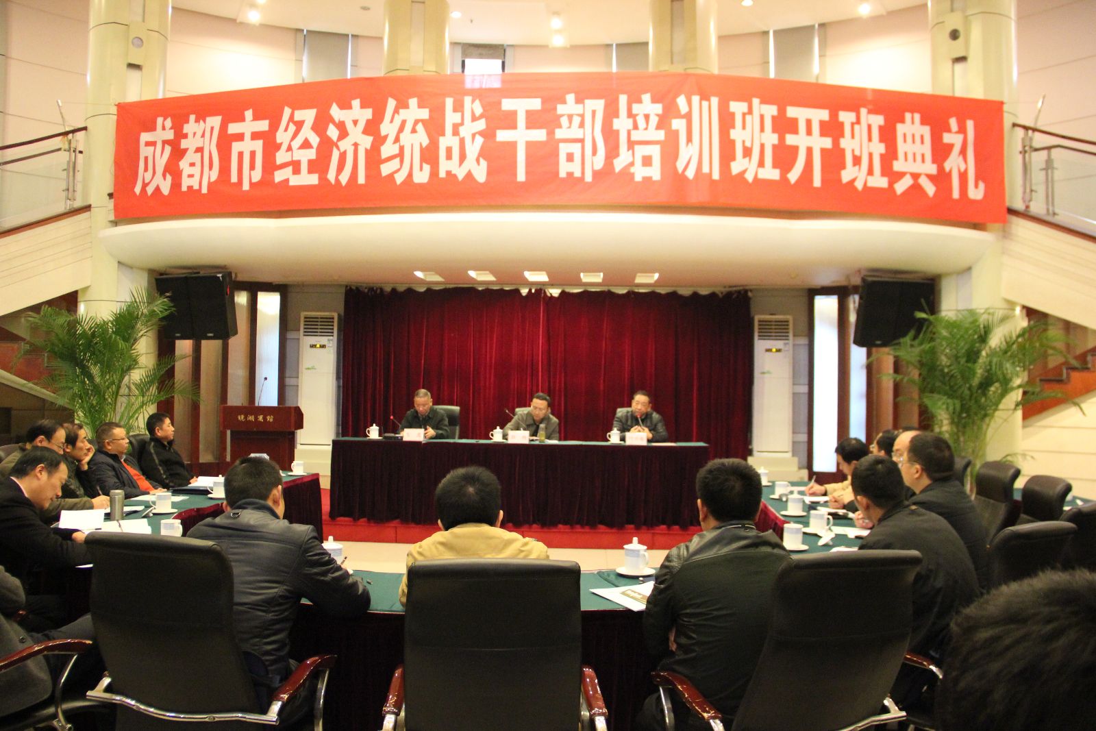 2013年12月11日,由中共成都市委统战部主办,suncitygroup太阳新城官网四川省干部教育培训高校基地(承担单位为suncitygroup太阳新城官网)具体承办的“成都市经济统战干部培训班”开班典礼在suncitygroup太阳新城官网镜湖宾馆多功能厅隆重举行。suncitygroup太阳新城官网党委副书记何云庵,中共成都市委统战部副部长、市工商联党组书记郭杨,中共成都市委统战部机关党委书记、经济处处长贺鹰,suncitygroup太阳新城官网党委书记刘斌等领导,成都市各区、市、县的经济统战干部等30余名参训学员共同出席了开班典礼,典礼由贺鹰书记主持。