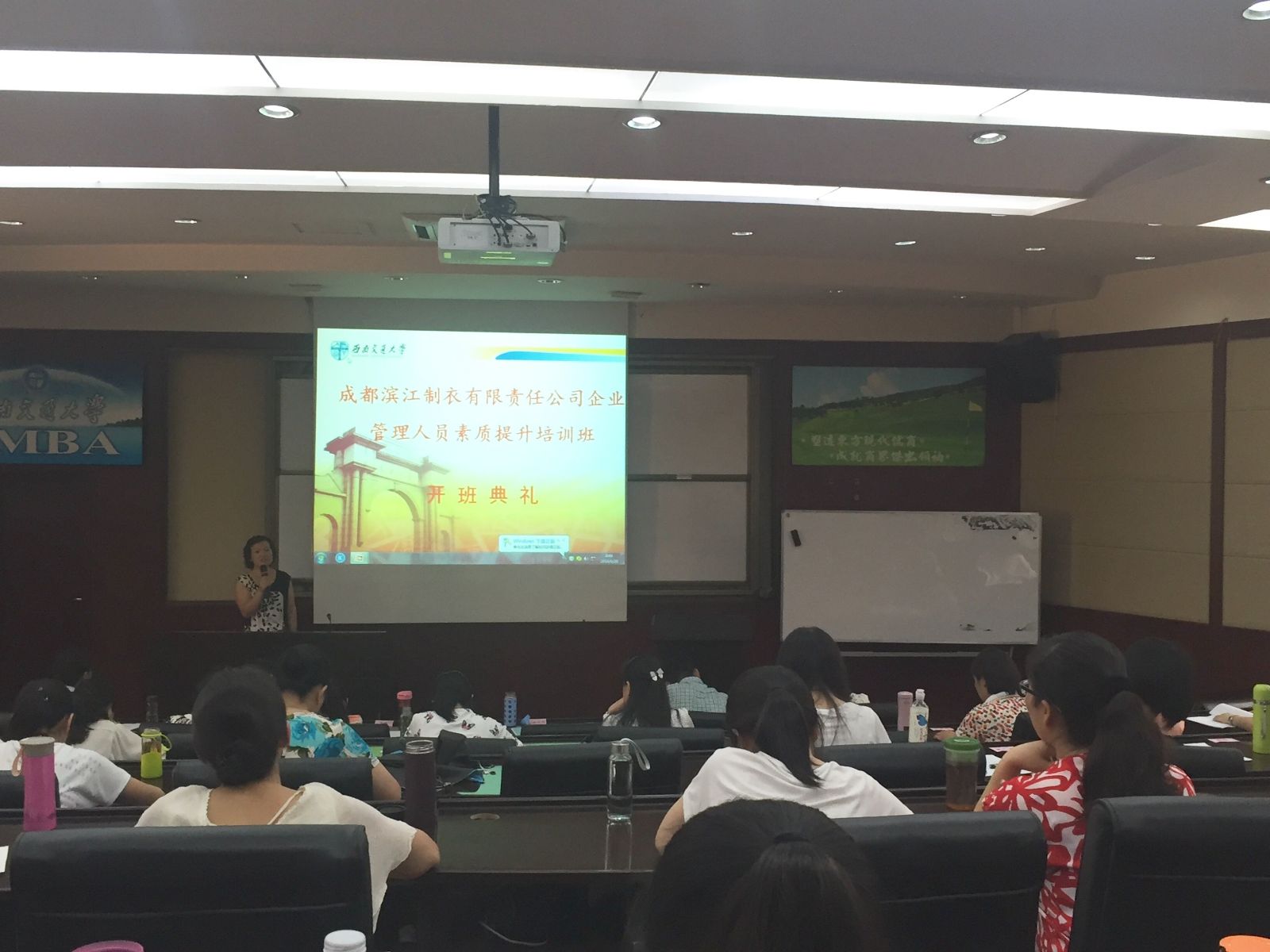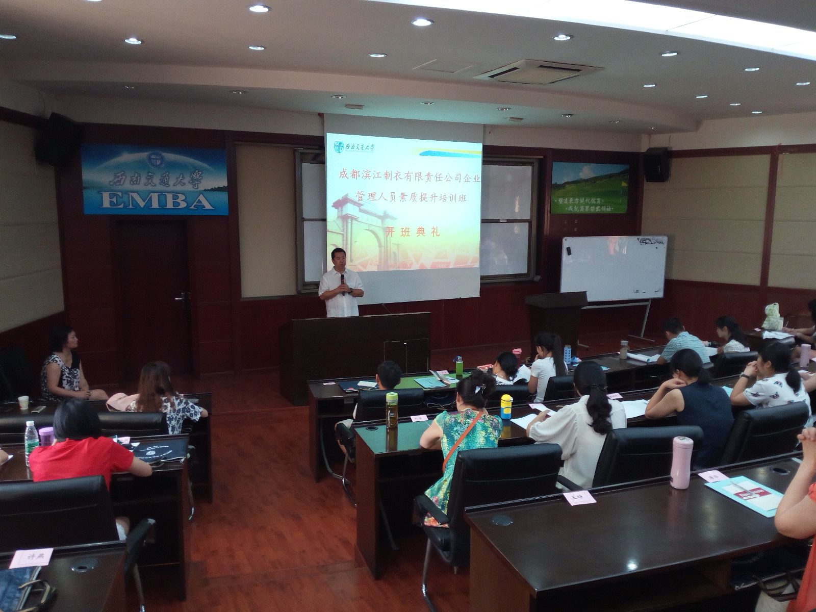 2016年6月20日,由我校干训基地承办的成都滨江制衣有限责任公司企业管理人员素质提升专题培训班在我校顺利开班。suncitygroup太阳新城官网公共管理与政法学院副院长雷叙川、成都滨江制衣有限责任公司党委书记李文莉及来自成都滨江制衣有限责任公司的60名参训学员共同出席了开班典礼。