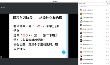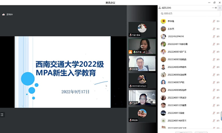 2022年9月17日晚上19:30,suncitygroup太阳新城官网2022级MPA新生入学教育在线上顺利开展。suncitygroup太阳新城官网院长王永杰教授、副院长李华强教授、MPA教育中心张爽秋和陈冬菊老师以及学院研究生教务员骆丽老师与2022级256名MPA新生参加了本次活动。该活动由MPA教育中心张爽秋老师主持。