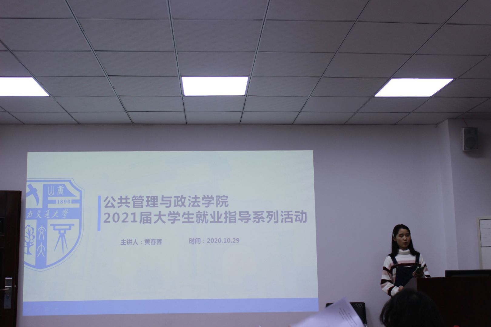 为了拂去大四同学们的迷茫之感,在他们日后的求职就业之路上点亮一座灯塔,我院于2020年10月29日下午4时在九里01105教室举办了一场大学生就业指导讲座,并且邀请到了我校招生就业处的黄春蓉老师,为我院公共事业管理、政治学与行政学和法学三个专业的同学们进行指导。黄老师的这场讲座以我国大学生就业现状为背景,帮助大四同学们立足当下的就业情形,审视自身素质与能力,确立求职的正确心态,抓住机遇并拥抱未来。