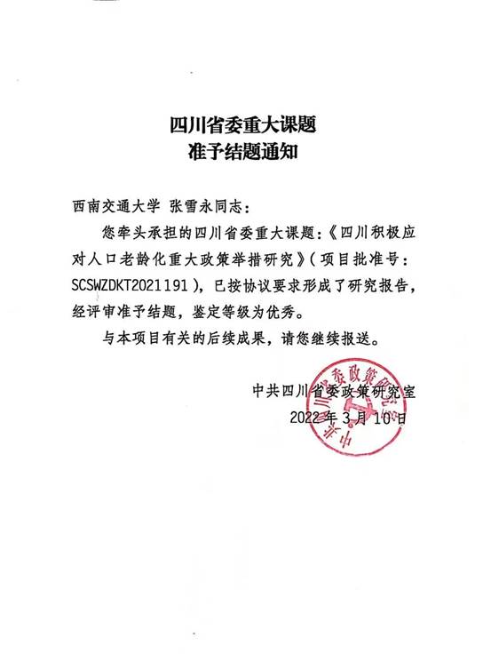 近日,我院张雪永院长牵头承担的四川省委重大课题:《四川积极应对人口老龄化重大政策举措研究》顺利完成,鉴定等级为优秀。